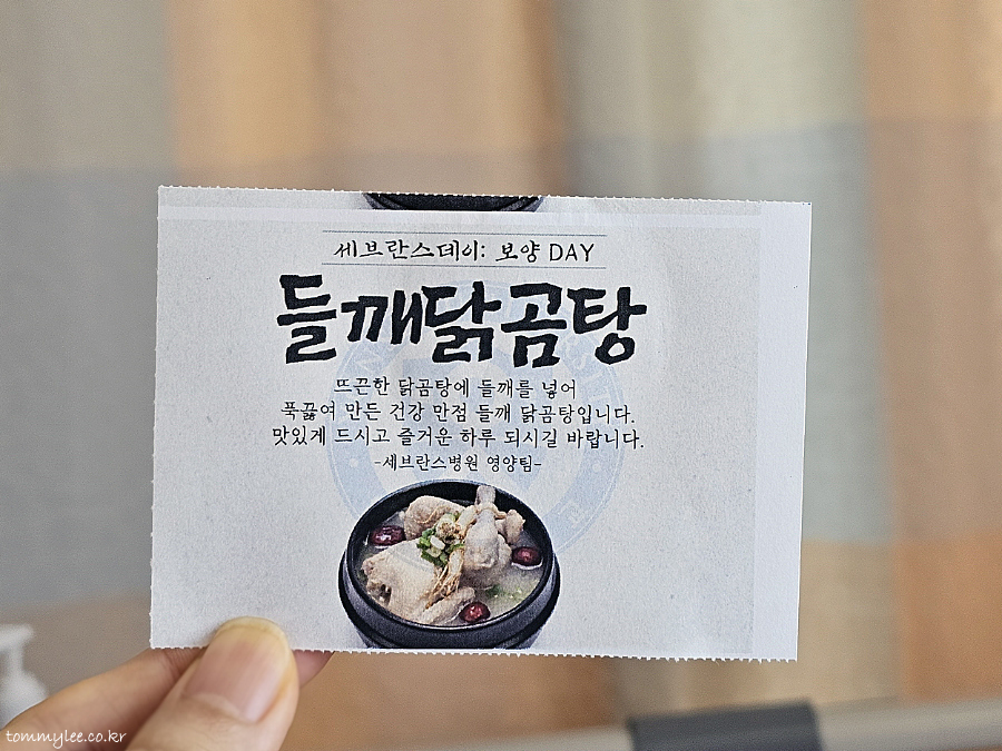 세브란스 데이 : 보양 DAY 특식 들깨닭곰탕.. 뜨끈한 닭곰탕에 들깨를 넣어 푹 끓여 만든 건강 만점 들깨 닭곰탕이라는 설명.. 9월이지만 밖은 한 여름 날씨라 그런지 보양식 나옴..