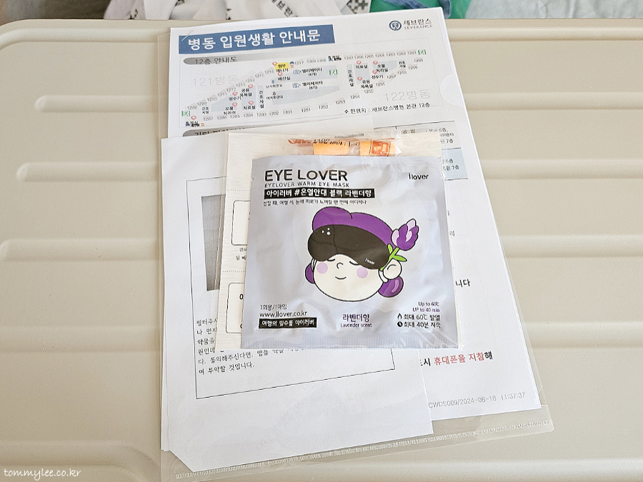 입원 전 안내해 주는 입원 시 필수준비물 : 세면도구, 수건, 물컵, 물통, 티슈, 실내화, 보호자침구류 등등의 개인 물품.. 병원 측에서 안대랑 귀마개가 웰컴선물(?)로 지급되었는 데 사용할 일은 없었어요.. 건너편 환자분이 많이 위중하셔서 의미가 아예 없었음.. ㅡㅡㅋ..