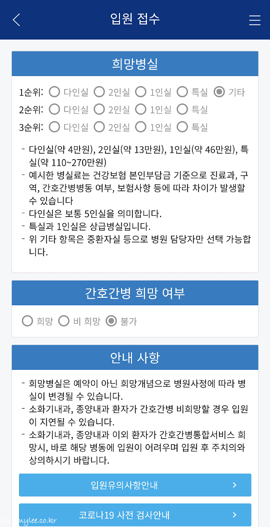 입원 희망병실은 형식상으론 환자가 원하는 희망병실 1순위, 2순위, 3순위를 제출해 반영하는 방식인 듯 하지만.. 실제론 환자가 아무것도 선택을 할 수가 없고, 병원 담당자만 선택을 할 수 있는 '기타'로 고정.. 결국엔 모든 것을 병원이 결정한 후 통보하는 오마카세 입원이었습니다.. 입원 당일 오전 시간에 원무과에서 오는 전화를 받은 후 지정된 병실을 알 수가 있답니다.. 저는 이번에 운이 좋아(?) 다인실로 배정받게 되었어요.. 병실 요금은 5인실 4만원, 2인실 13만원, 1인실 46만원, 특실 110만원이라고 합니다.. 의외로 병실비가 별로 안올랐네요.. 1인실이 가격이 거의 그대로였음..