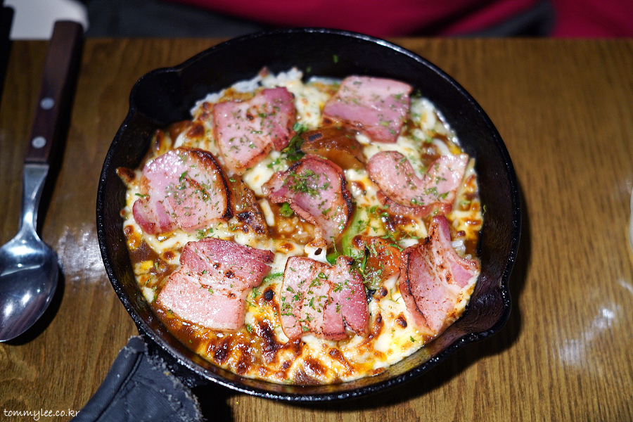 두께감이 꽤 있는 삼겹살 토핑이 꽤 실하게 들어가 있고.. 치즈도 모짜렐라 단독이 아닌 블렌드 치즈를 사용해 성의 있다고 지인분께서 호평.. 메뉴 설명에 보면 3가지 치즈를 섞은 트리플 치즈 토핑이라고 함..