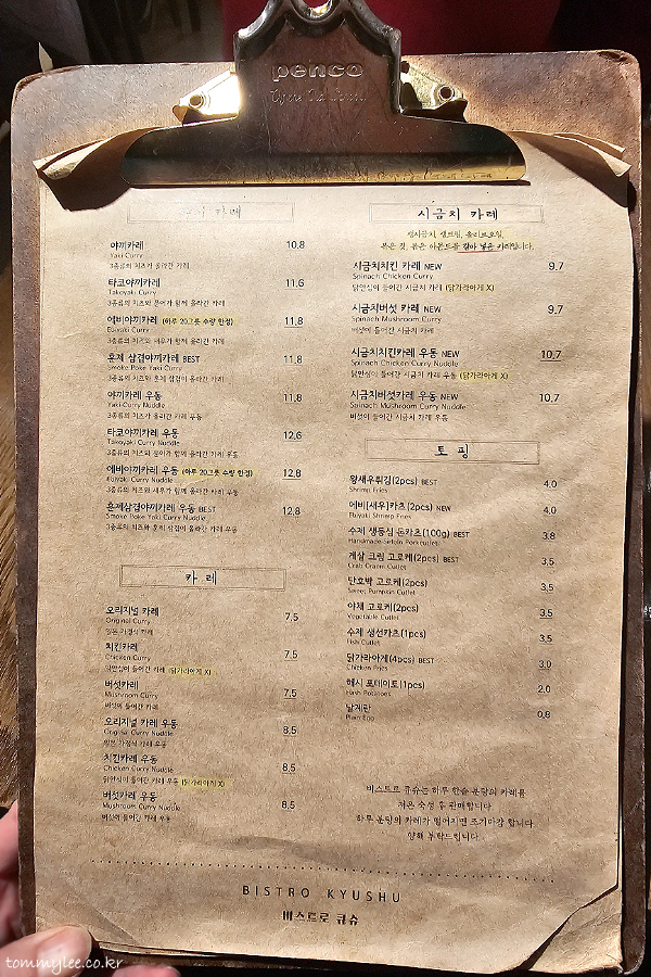 홍대 언덕길의 작은 카레야지만 메뉴는 꽤 버라이어티하네요.. 카레가 라이스만 있는 게 아니고 우동도 있고.. 메뉴 선택권이 많아 좋긴 하네요.. 대표메뉴 오리지널카레 7,500원, 야끼카레 10,800원, 시금치치킨카레 9,700원으로 가격도 착한 편..