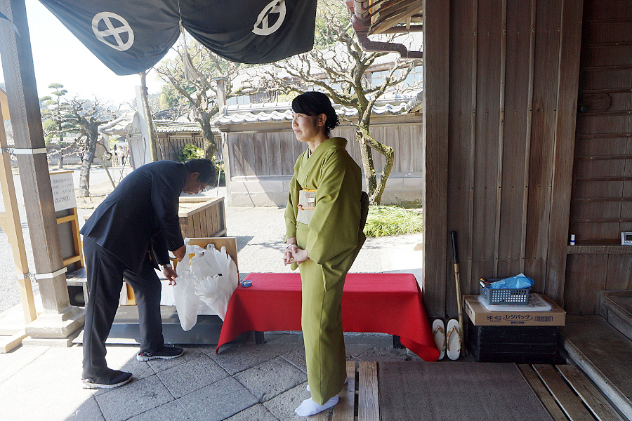 고텐에서 가장 인기있는 곳은 이 사쿠라지마가 보이는 거실 뷰.. 계속 기다렸는데.. 이 할머니가 계속 나오질 않으셔서 그냥 포기하고 사진 찍고 이동하기로..