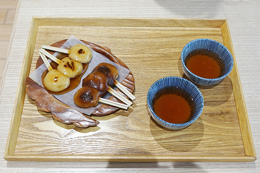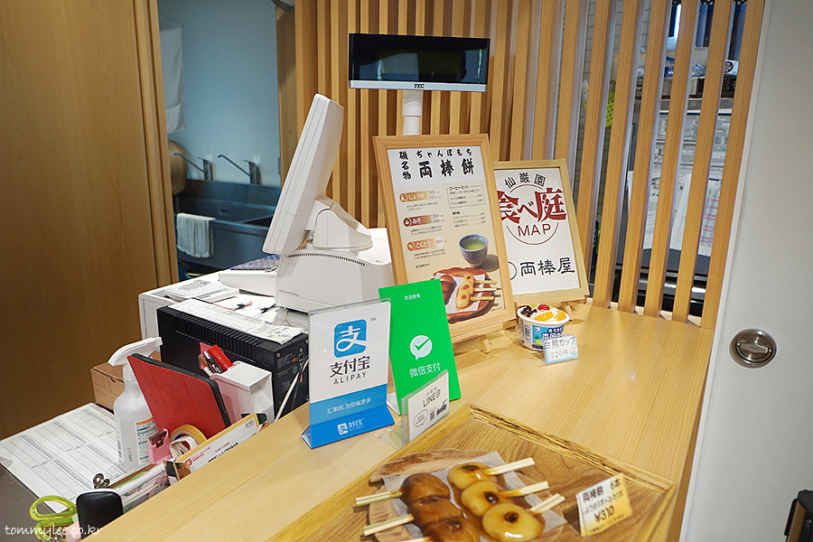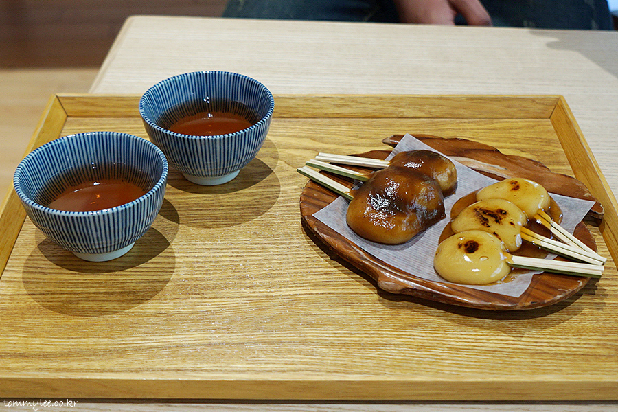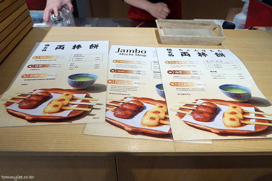 쟘보모치는 쇼유(간장), 미소(된장), 코쿠토(흑당) 3가지 맛이 있고 6개, 10개 단위로 구입가능.. 흑당은 6개만 판매하고 가격도 1.5배.. 카페가 아닌 떡집인지라 오챠 무료 제공.. ALL SERVED WITH GREEN TEA.. 영어메뉴 있음..