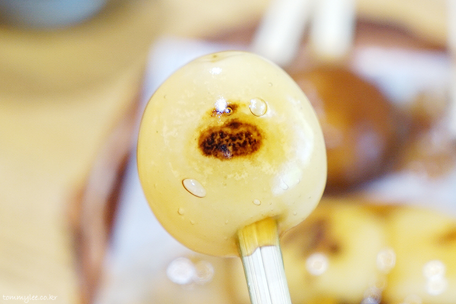 색이 밝은 떡이 간장떡이고요 어두운 쪽이 된장떡입니다.. 꼬치가 젓가락처럼 한쌍으로 꼽아 구운 게 특징이랍니다..