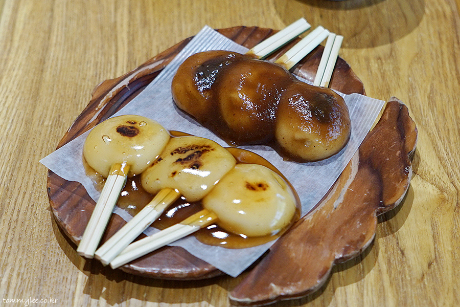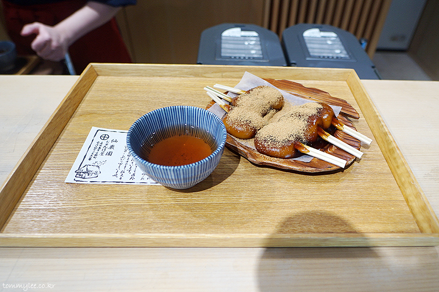 저희가 주문한 건 아니고 앞손님이 주문하신 흑당모찌 도촬.. ㅋㅋㅋ.. 흑당은 가격이 6개 450엔으로 된장이나 간장맛보다 더 비쌌는데요.. 흑당에 키나코 토핑까지 뿌려주고 하니까 더 비쌀 수밖에 없긴 하겠네요....
