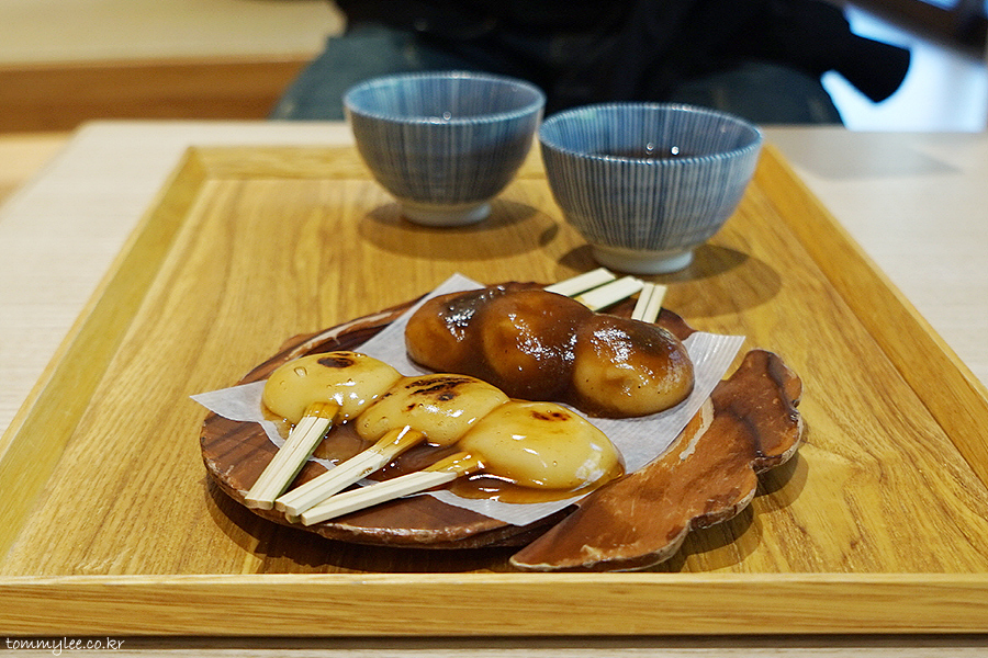 하나하나 나무꼬치에 끼워 구워낸 야키모치이고요.. 이 쟘보모찌 6개에 차까지 주는데 310엔은 정말 축복의 가격이라고 생각합니다.. 지금은 가격이 올라서 500엔이라고 해요.. 엔야스 + 쌀부족으로 인해.. ㅠ.ㅠ..
