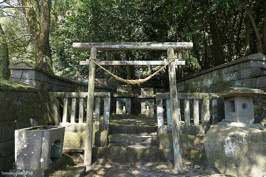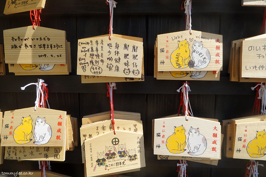 옛날에는 고양이 동공 사이즈의 변화로 시간을 알 수가 있었다고 합니다.. 엥?? 하는 부분이지만 당시 일본 장수들은 고양이를 시계대용으로 데리고 다녔다 함.. 시마즈 번주가 임진왜란 때 조선으로 넘어갈 때 시간 파악을 위해서 시계용 고양이 7마리를 데리고 넘어갔는데.. 전쟁 후 일본으로 그중 2마리가 살아서 돌아왔다고 합니다.. 이 고양이들의 용맹함(?)을 기리기 위해 묘신으로 추대하고 이 신사가 세워진 것이라는 스토리..
