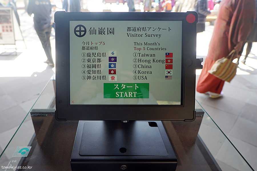 센간엔은 우리식으로 읽으면 선암원이 됩니다.. 방문객 앙케이트 조사 패널이 있는데.. 방문객 순위가 재미있어서 찍어봤어요.. 국내 방문객은 카고시마현-토쿄도-후쿠오카현-아이치현-카나가와현 순이고.. 외국인 방문객은 대만-홍콩-중국-한국-미국 순서.. 홍콩이 왜 2위??.. 그나저나 한국이 4위라니 역시 예상한 대로 한국분들은 잘 안 오는 관광지인 걸로.. 임진왜란이랑 관련도가 높은 관광지라 많이 오실 법도 한데.. ㅡㅡㅋ.. 특이한 게 다이묘정원치곤 서양 방문객이 적다는 점..