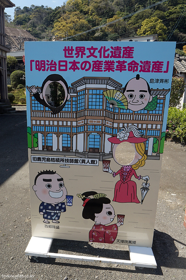 세계문화유산 메이지 일본 산업혁명 유산이라고 쓰여있고.. 이진칸 방문 기념사진을 재미있게 찍어볼 수 있네요.. 사츠마 키리코 글라스를 하나씩 들고 있는 게 재미있네요.. ㅡㅡㅋ..