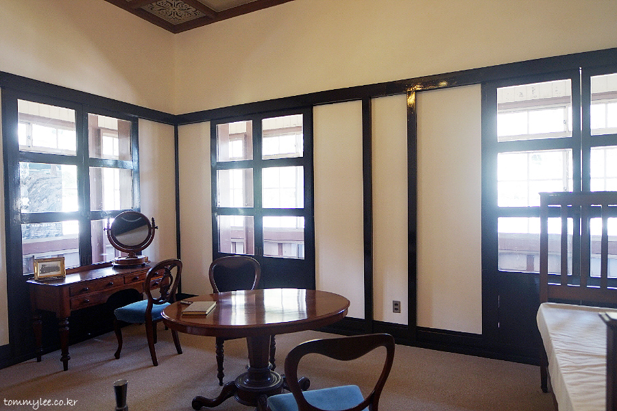 이 방을 보면서 특이했던 게 창쪽에는 이렇게 타다미가 깔려 있었어요.. 외관상으론 완전 서양식 건물이지만 일본스런 양식도 함께 공존했다는 거..