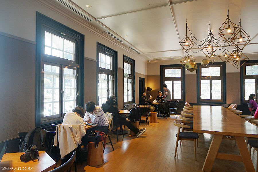 스타벅스 카고시마센간엔점 2층을 올라와보면 이런 느낌.. 커뮤니티 테이블이 중간에 크게 있고 그 위의 조명이 멋지네요..