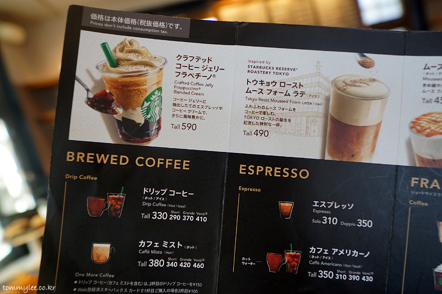 오랜 기다림 끝에 저희 차례가 왔네요.. 일본 스타벅스는 기본 메뉴판이 일본어, 영어 병기가 되어 있어서 주문하기가 너무 편하답니다.. 메뉴판 가격에 세금이 붙어서 가격이 더 나온다는 거..