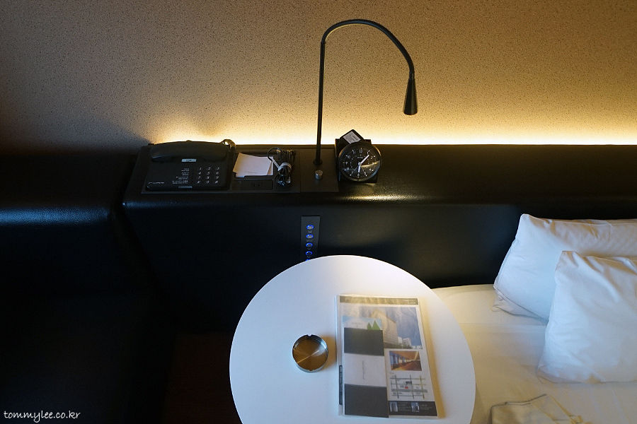 전화기, 메모킷, 알람시계가 침대 위에 자리하고 있는 모습.. 테이블에 재떨이가 있지만.. 현재는 전실 금연실로 운영이고 흡연부스는 3층에 있다고 하네요..