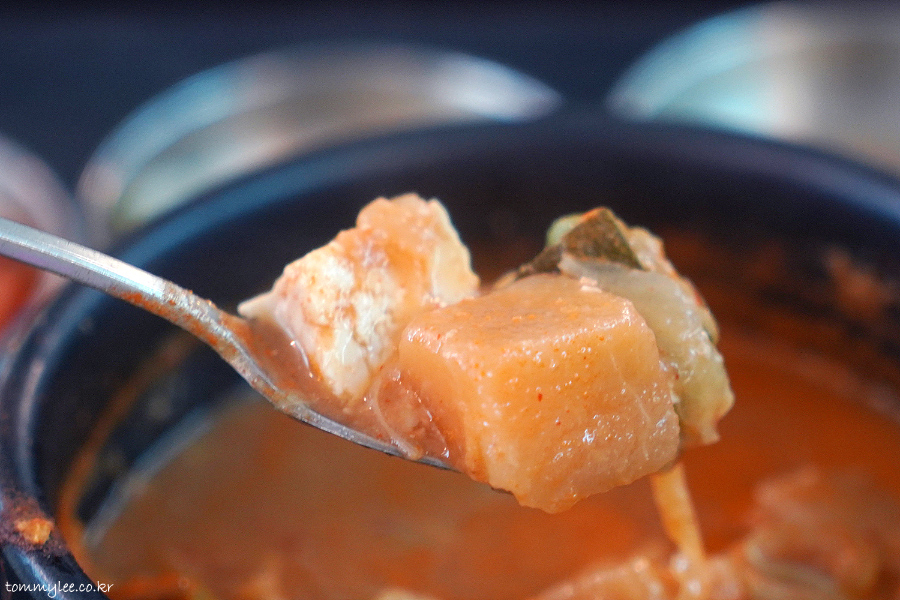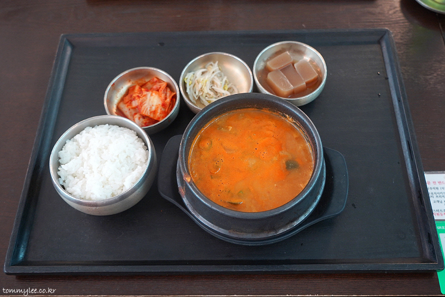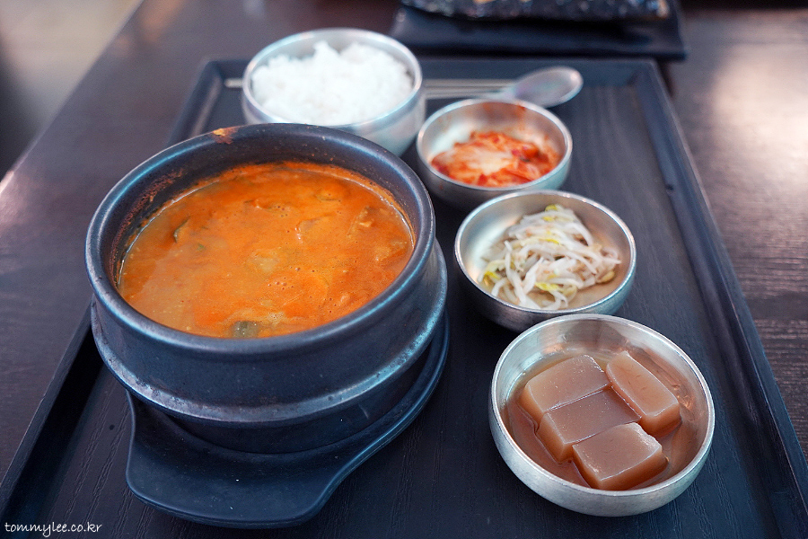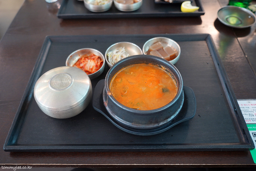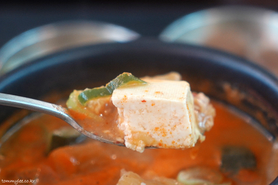 돼지고기랑 두부에 양파, 호박이 들어 있고 칼칼한 맛.. 맵고 시고 좋네요..