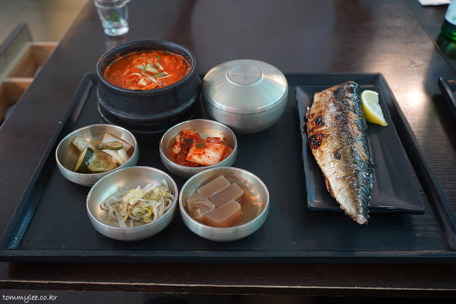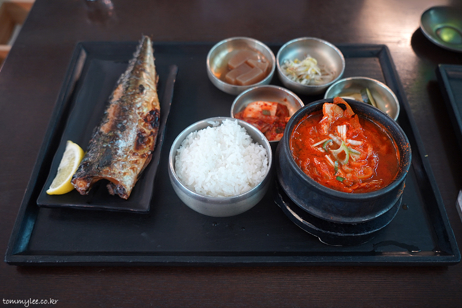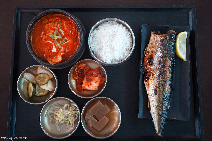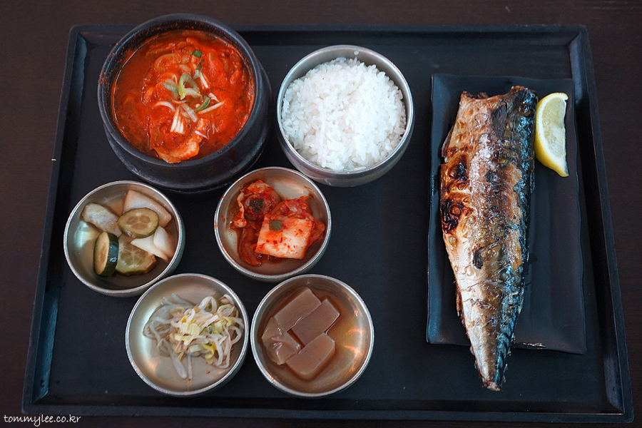 GRILLED MACKEREL AND PORK KIMCHI STEW.. 고등어구이와 돼지고기 김치찌개 반상.. 17,000원..
