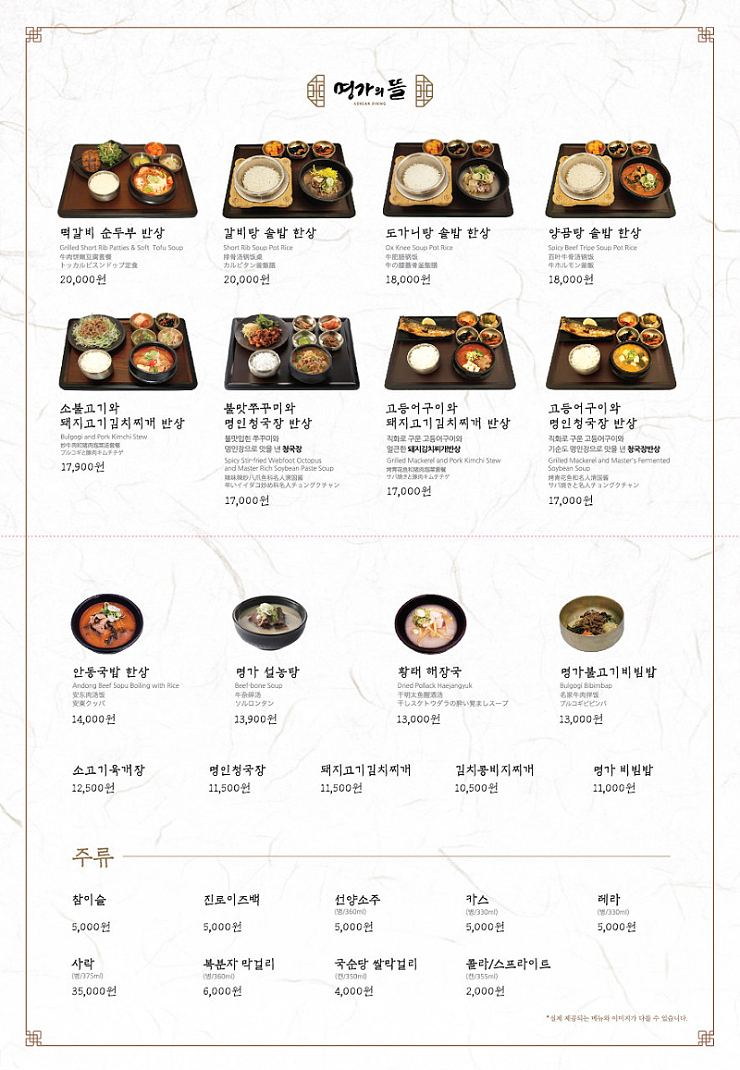 명가의뜰 2024 최신 메뉴판 가져와봤습니다.. 명가의뜰이 가격이 또 올랐네요.. 4년간 가격인상 없이 굳건히 버텨 왔다가 2작년에 살짝 오르고 최근의 식재료 물가 인상은 견딜 수가 없었던지 또 올랐습니다.. 주류, 음료, 고가라인 메뉴들은 가격 그대로이고.. 나머지는 천원정도 올랐습니다.. 급격하게 오른 서울 시내 외식 물가에 비하면 오른 것도 아니지만..