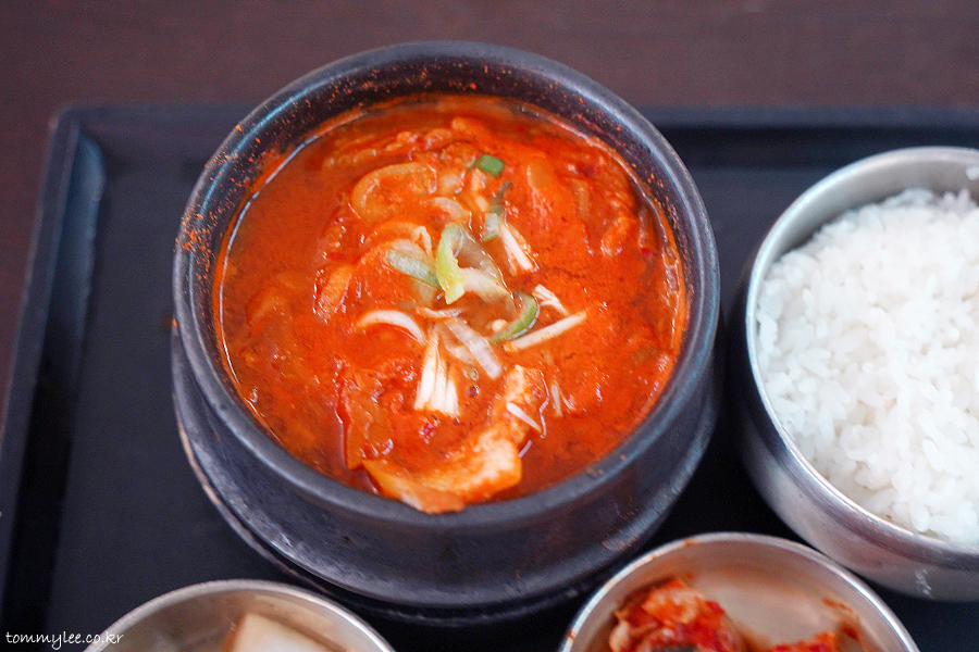 두툼한 뚝배기에 제대로 뜨겁게 나온 김치찌개.. 너무 빨개서 적응 힘들.. 일본에는 이런 게 진짜 없거든요.. ㅋㅋㅋ..