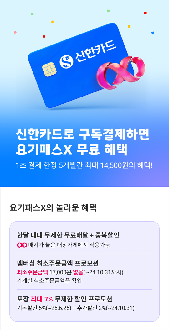 [요기요] 신한카드로 구독결제 시 요기패스X 무료 혜택
