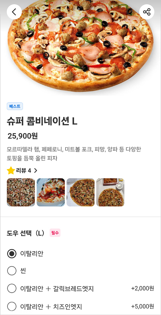 요기패스X 가입기념으로 빨간모자 피자를 주문해 봤습니다.. 유튜브 간다효 채널에서 아흥~ 신음소리 내면서 콤비네이션 피자 맛나게 먹는 거 보고 너무 먹고 싶어서 빨모피자를 주문하게 되었네요.. 빨간모자피자는 일반 콤비네이션은 없고 슈퍼콤비네이션이 기본입니다.. 갈릭브레드엣지는 2천원 추가, 치즈인엣지는 5천원 추가네요.. 저는 기본 도우인 이탈리안으로..