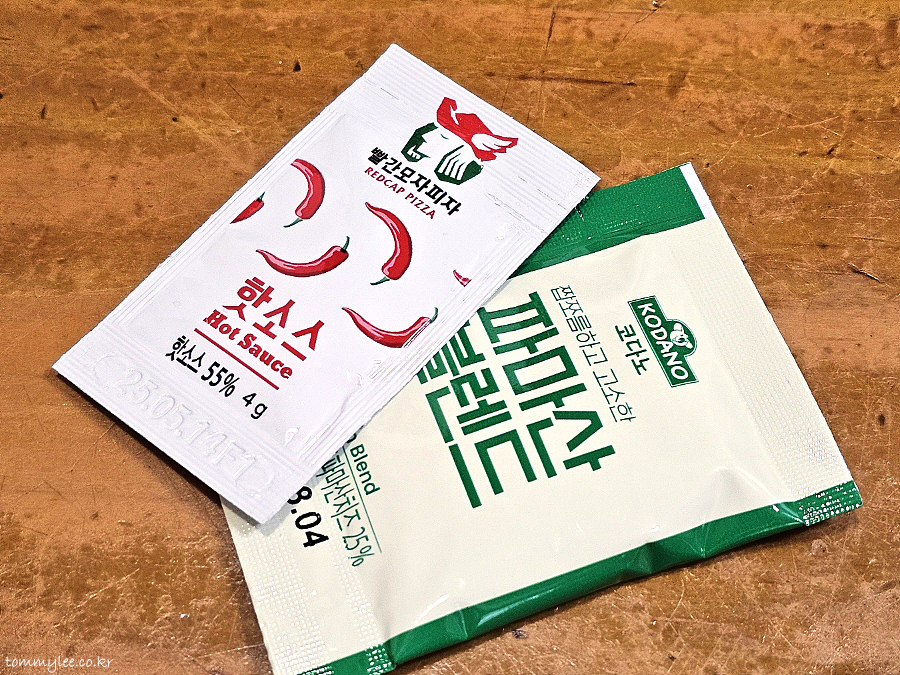 빨간모자 핫소스와 코다노 파마산 블렌드 치즈..