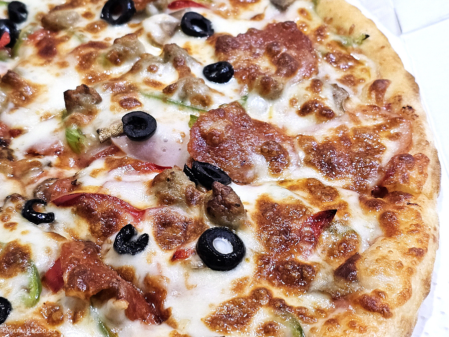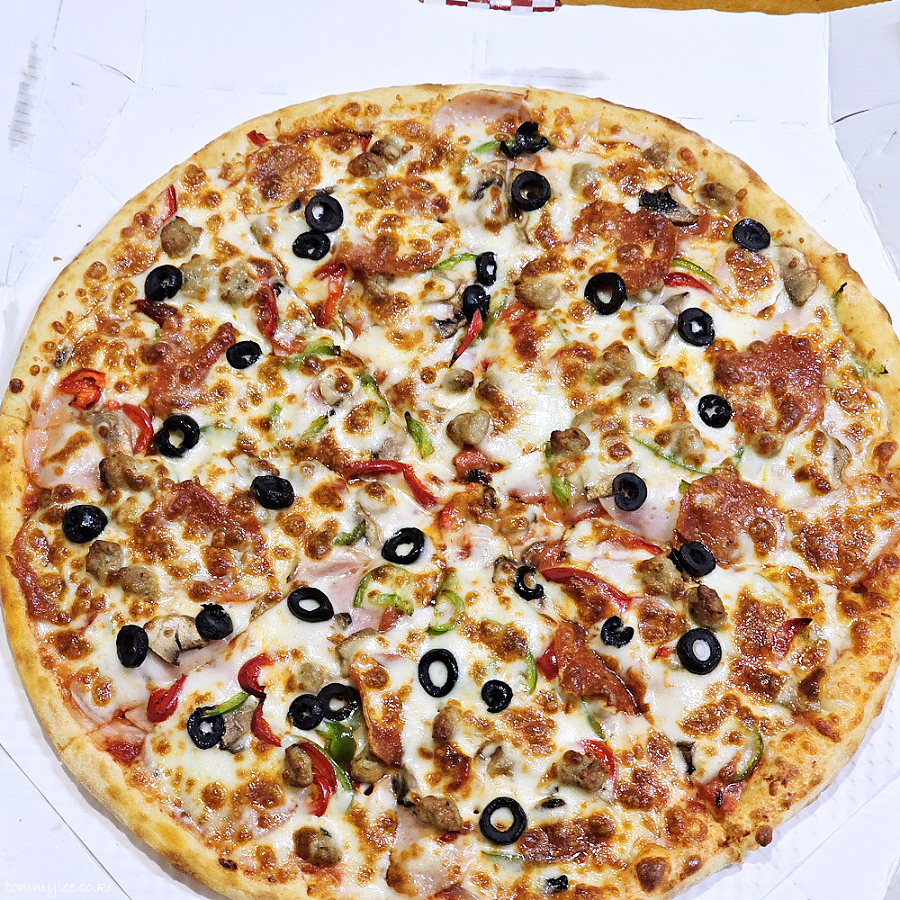 훈훈한 비주얼의 슈퍼콤비네이션 피자입니다.. 다양한 토핑이 들어간 가장 무난한 피자가 아닐까 싶고요.. 도우는 기본이 이탈리안인데요.. 빨간모자는 씬도우도 추가금 없이 주문가능합니다..