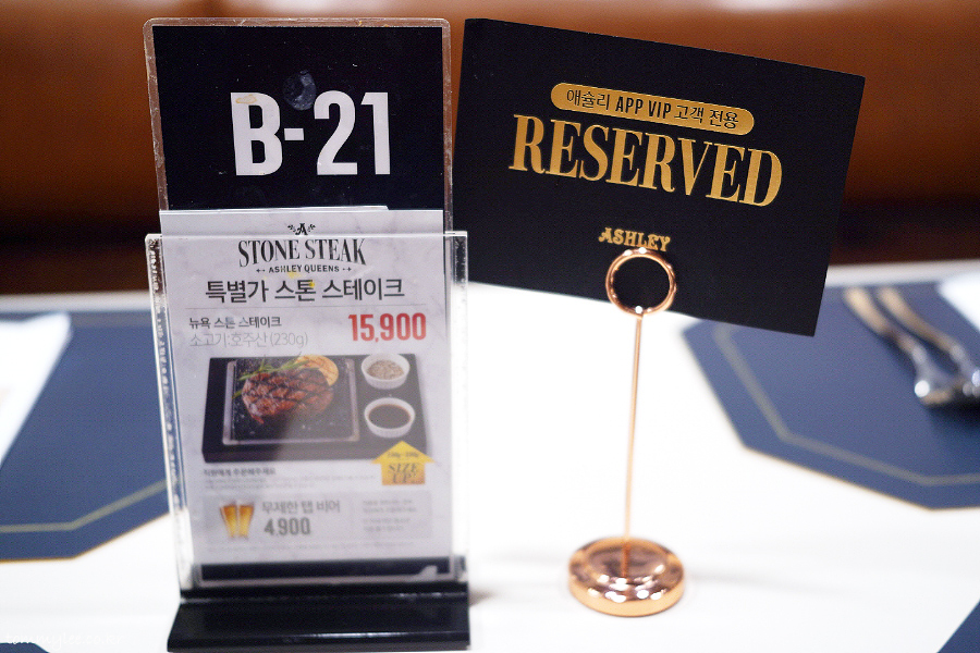 애슐리퀸즈 종각역점 B섹션 21번 테이블로 안내받게 되었네요.. 애슐리 APP VIP 고객전용 RESERVED 카드가 테이블에 세워져 있습니다.. 지인분 2분 께서 무제한 탭비어 이용하신다고 하셔서 9,800원 추가결제 넣어 드렸습니다..