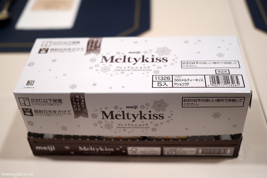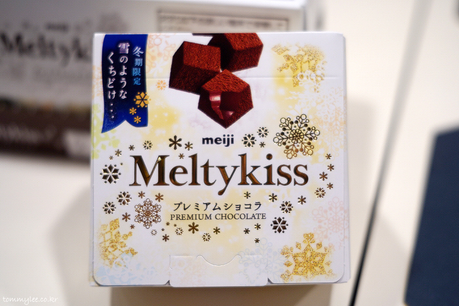 하나씩 모임 기념품으로.. MEIJI.. MELTYKISS PREMIUM CHOCOLATE.. 메이지 메루티키스 푸레미아무쇼코라.. 겨울한정.. 눈과 같이 입안에서 녹는 느낌.. 생초콜릿 같은 식감을 주는 약간 비싼 초콜릿이랍니다.. 열에 약해 23도 이하란 컨디션을 충족해야 해서 동절기 한정으로 나오는 초콜릿 제품..