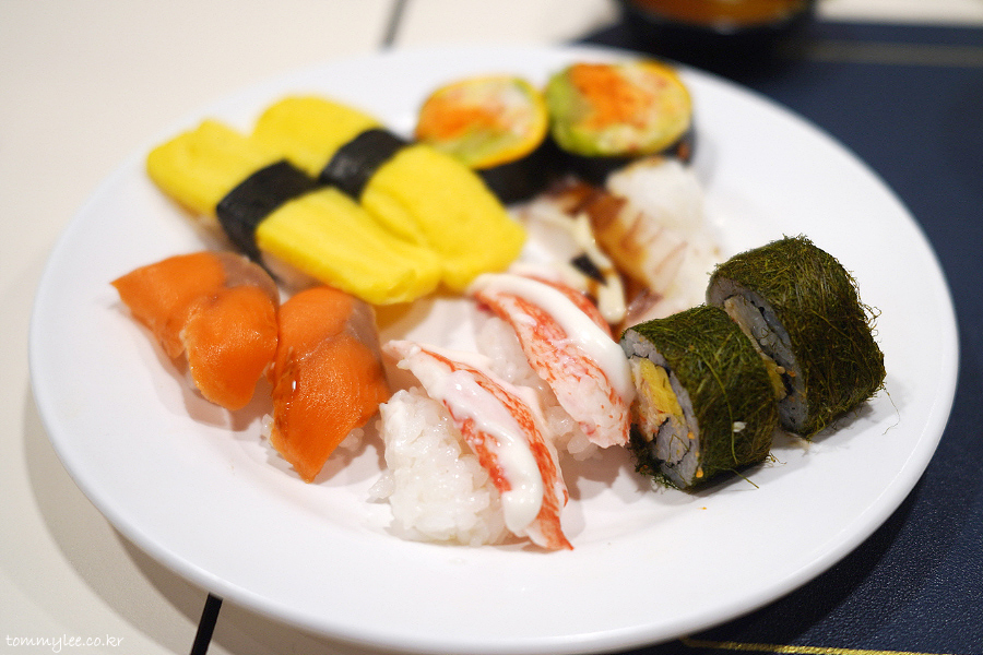 스시 모리아와세.. 대게살초밥, 연어초밥, 계란초밥, 치즈롤, 오징어초밥, 감태롤의 구성인 것 같네요..