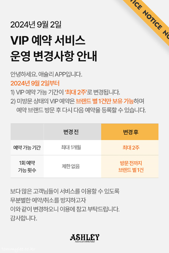 최근 VIP예약 서비스로 장난치는 분들이 있는지.. 예약가능 기간이 2주 이내로 변경되었고, 1회 예약 가능 횟수 또한 브랜드 별 1회로 제한된다는 공지가 있습니다.. 노쇼 페널티가 없어서인 듯.. 노쇼는 범죄입니다..