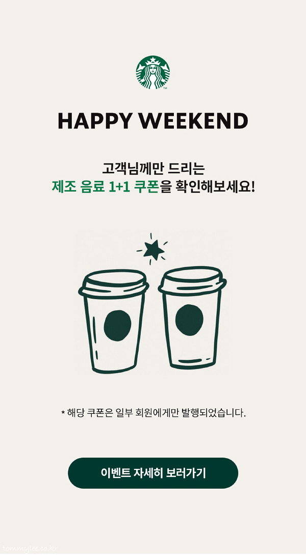 HAPPY WEEKEND.. 고객님께만 드리는 제조 음료 1+1 쿠폰을 확인해보세요.. 유효기간이 이틀뿐인 게 조금 그랬지만 뭐 바로 가면 되는 거니까.. 어쨌거나 타겟 쿠폰은 써줘야 마땅한 거죠..