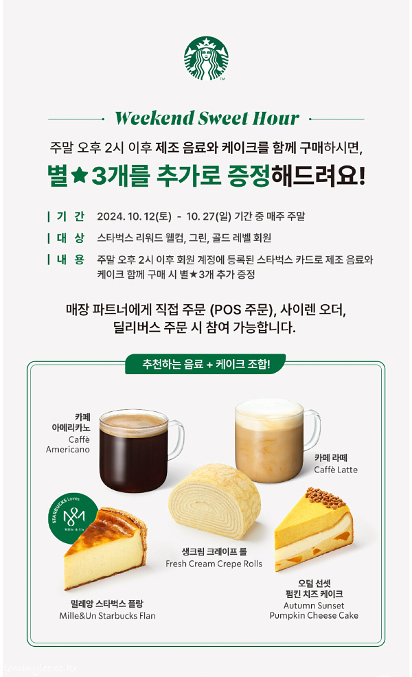 주말 스윗아워 행사도 같이 참여할 수가 있었네요.. 주말 오후 2시 이후 제조음료와 케이크를 함께 구매하면 별 3개를 추가 증정하는 훈훈한 이벤트였답니다..