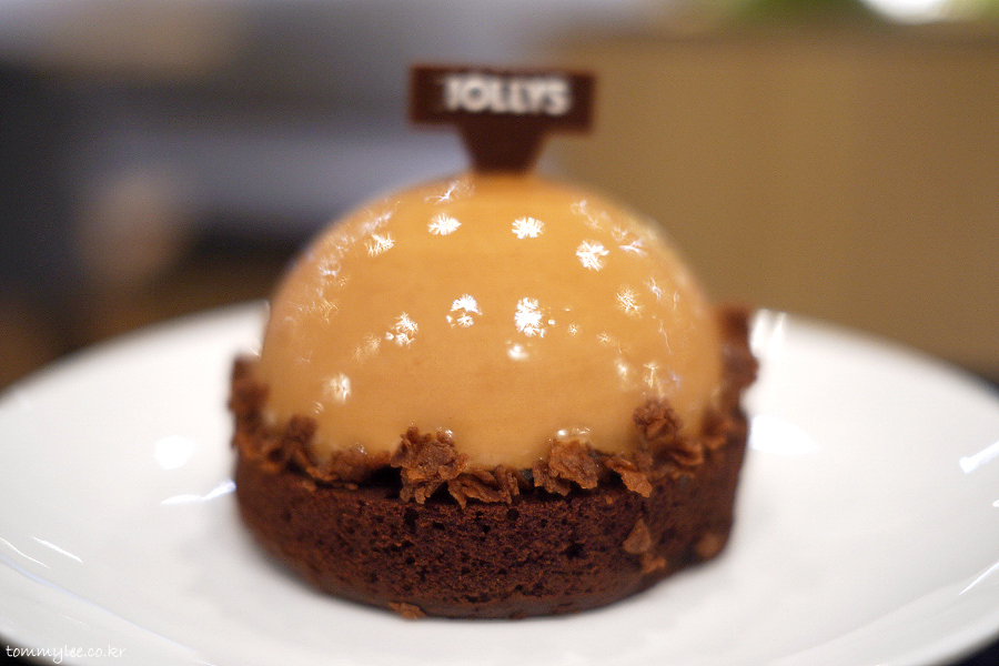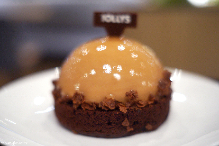위에서 바라보면 이런 느낌.. 초콜릿 케이크 위를 밀크초콜릿 무스돔으로 예쁘게 뚜껑을 씌우고 초콜릿 크럼블로 레이스를 둘렀네요.. 할리스답지 않은 과감한 디자인 굿굿..