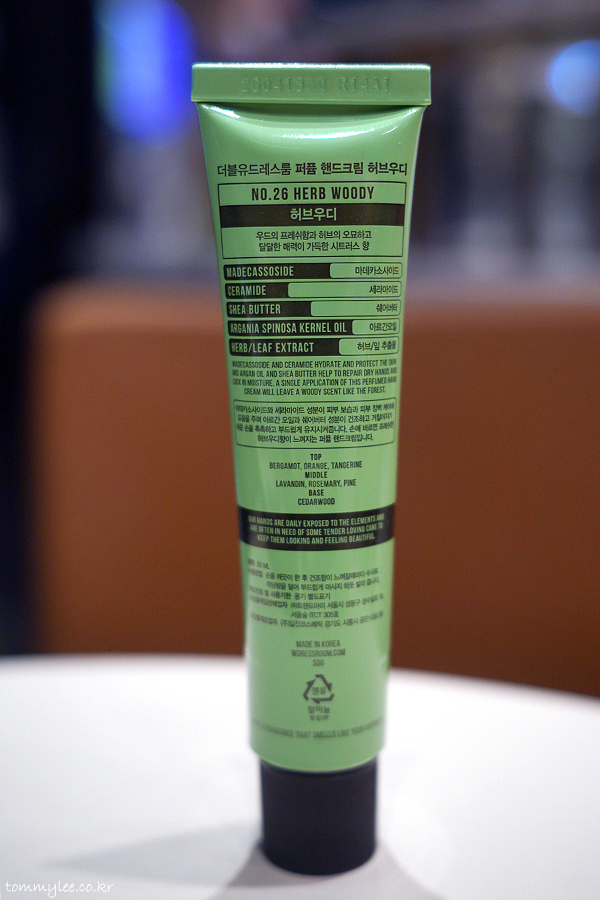 NO.26 허브우디 핸드크림은 우드의 프레쉬함과 허브의 오묘하고 달달한 매력이 가득한 시트러스 향이란 설명.. 키포인트 성분으로는 마데카소사이드, 세라마이드, 쉐어버터, 아르간오일, 허브잎추출물을 함유하고 있다고 하네요..