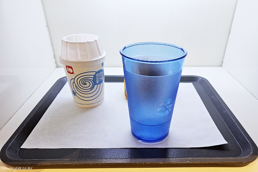 픽업 박스에서 이렇게 주문한 메뉴를 꺼내시면 되는 거.. 탄산음료은 완전 셀프라 컵만 나와요..