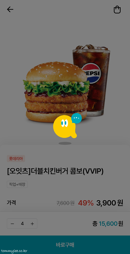 저는 멤버십 VVIP라 오잇츠 더블치킨버거 콤보를 3,900원에 구입할 수 있었습니다.. 49%할인이라고 하니까 반값이라고 보셔도 무방합니다.. 전에는 잇츠데이 롯데리아 멤버십 VVIP 쿠폰은 1장만 구입할 수 있었는데.. 지난달부터인가 여러 장 사도 되더라고요.. 그래서 6장 영입.. 11월은 더블치킨버거로 쭉 달리게 될 듯??.. 너무 싸서 그만.. ㅠ.ㅠ..