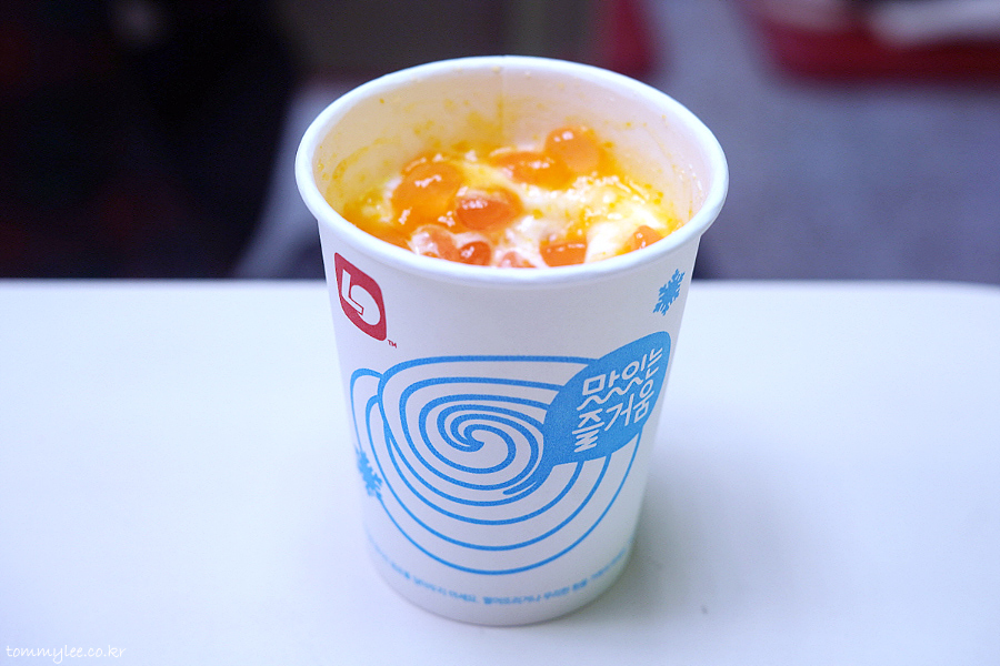 토네이도 망고젤리는 특별히 안돌려서 나가는 건가 궁금해서 검색해 봤는데.. 다들 스푼으로 마구 잘 돌려줬더라고요.. 제가 9시 이후 방문이라 늦게 가서 안된 것 같기도 하고.. 암튼 토네이도를 주문했으나 선데가 나왔다는 스토리.. 직원이 건네 줬으면 기계 고장이라던가 뭔가 설명하고 줬을 것 같긴 하지만 여긴 무인점포라서.. ㅠ.ㅠ..