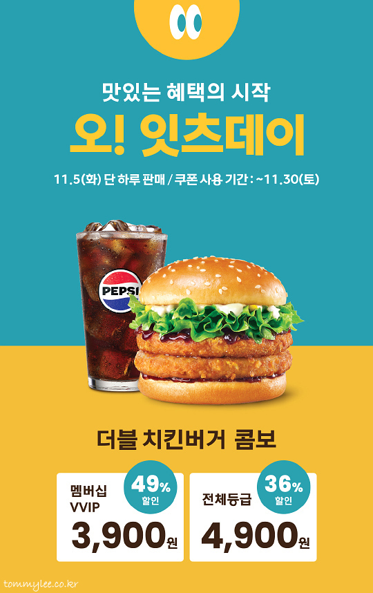 더블치킨버거는 매장에서 바로 드셔야 그 맛깔짐을 제대로 느끼실 수 있긴 하지만.. 뭐 어쨌거나 더블치킨버거 잇츠데이쿠폰 덕분에 훈훈한 11월이 될 전망이랍니다..
