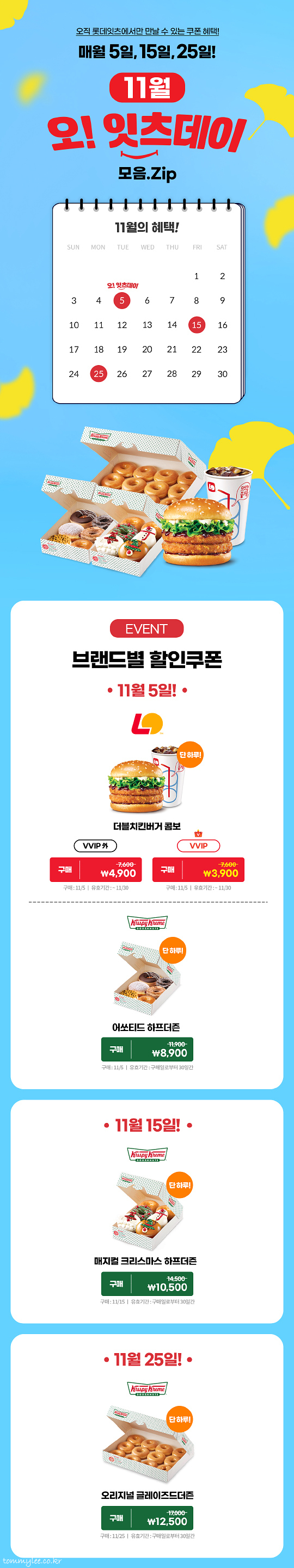 오직 롯데잇츠에서만 만날 수 있는 쿠폰 혜택.. 매월 5일, 15일, 25일은 오! 잇츠데이.. 이번 잇츠데이 행사 내용은.. 11월5일 롯데리아 더블치킨버거콤보 4,900원, 크리스피크림 어쏘티드하프더즌 8,900원 / 11월15일 크리스피크림 매지컬크리스마스 하프더즌 10,500원 / 11월25일 오리지널글레이즈드 더즌 12,500원.. 아쉽게도 11월에 엔제리너스는 잇츠데이 행사에 참여하지 않네요.. 왜지??..
