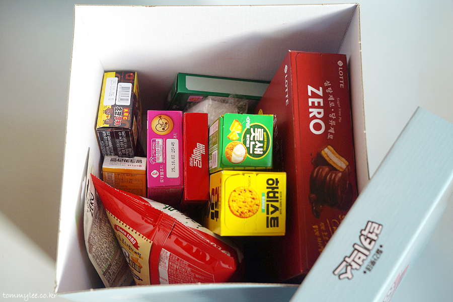 박스 오픈해보면 이런 느낌.. 과자들이 이렇게 들어있답니다.. 럭키박스 상품구성은 고정으로.. 모든 럭키박스가 동일하게 세팅되어 알고 있었고요.. 랜덤으로 레트로장난감이 들어 있다고 합니다..