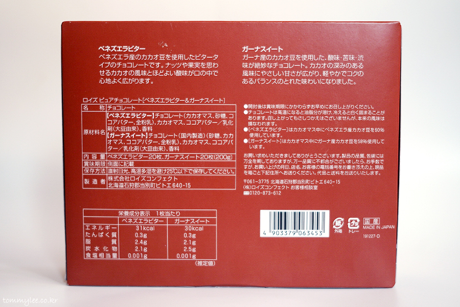 원재료.. 베네주엘라비터 : 초콜릿(카카오매스, 설탕, 코코아버터, 전지분유), 카카오매스, 코코아버터/유화제, 향료.. 가나스위트 : 초콜릿(국내제조)(설탕, 카카오매스, 코코아버터, 전지분유), 카카오매스, 코코아버터/유화제, 향료.. MADE IN JAPAN..