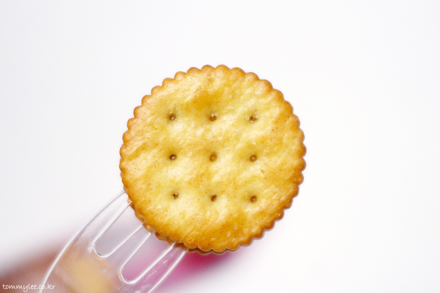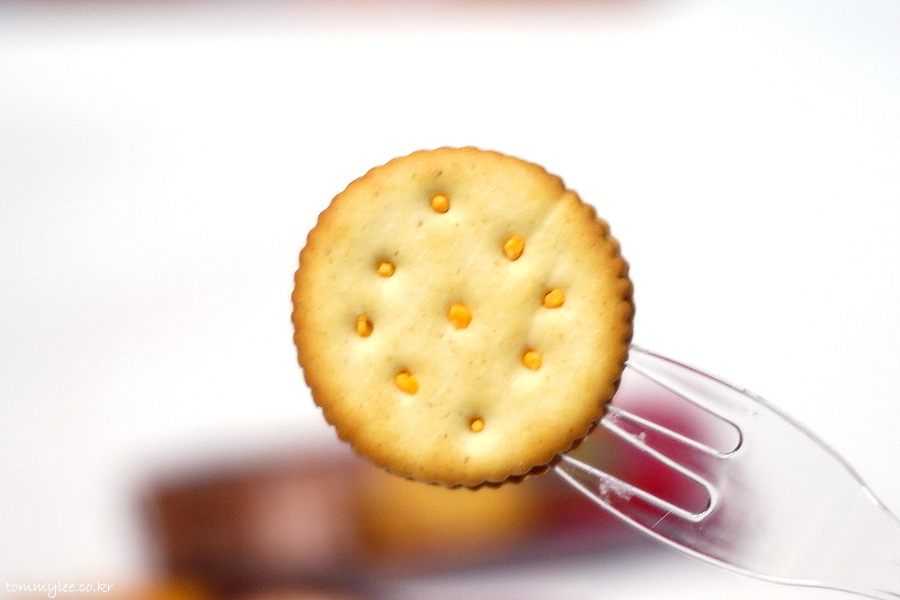 리츠 크래커 치즈 샌드를 집어 들면 이런 느낌.. 크래커 구멍 사이로 치즈 필링이 들여다 보이는 이 사랑스런 비주얼..