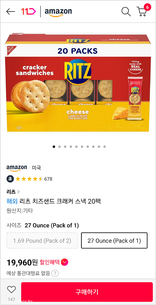 지인분께서 먹을만한 과자가 없다고 하셔서 오랜만에 아마존 직구로 리츠 크래커 샌드위치를 구입하게 되었답니다.. 리츠는 우리에겐 제크 오리지널 과자로 유명한 제품이고요.. 우리나라에서는 동서식품에서 나비스코 리츠를 판매하고 있지만.. 오리지널 미제 리츠 크래커를 지인분들께서 더 좋아하시는 관계로.. 11번가 아마존 미국직구로 구입하게 되었답니다..