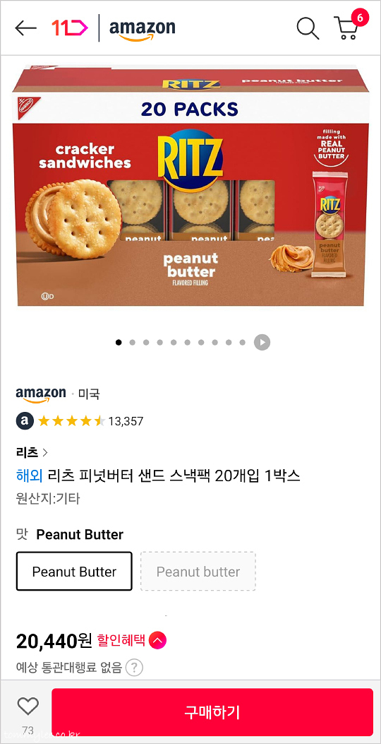 리츠 치즈 샌드는 우리나라에도 있지만 피넛버터 샌드는 인기가 없는 관계로 국내생산을 안합니다.. 대신 초코, 화이트가 인기라고.. 아무래도 주 소비층이 차이가 있다 보니까 그런 듯하네요.. 치즈 샌드는 국내 마트에서 구입하셔도 OK지만.. 피넛버터 샌드는 직구가 정답이라는 거.. 11번가 아마존 리츠 피넛버터 샌드 스낵팩 20개입 구입 링크 → 요기로..
