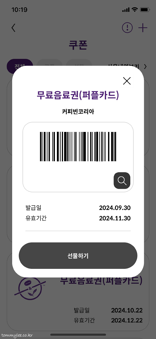 11월30일까지인 퍼플카드 무료음료권이었답니다.. 지인분께서 음료 12잔 마시고 받으신 소중한 쿠폰.. 바로 저의 커피빈앱에 등록 완료..