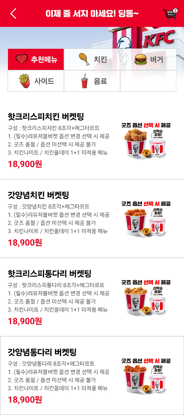 행사 메뉴 가격은 18,900원 균일가.. 핫크리스피치킨 23,200원→18,900원, 핫크리스피통다리 24,000원 →18,900원 , 갓양념치킨 25,400원 →18,900원 , 갓양념통다리 26,200원 →18,900원.. 최소 18%할인이고요 갓양념통다리 버켓을 앱오더 하면 최대 할인율인 33%가 나오네요.. 이번 메리 버켓팅 행사에서 중요한 건 KFC 앱으로 배달이 아닌 징거벨오더로 리유저블버켓 옵션을 반드시(!) 선택하고 픽업까지 해야 모든 혜택을 다 챙길 수 있다는 것..