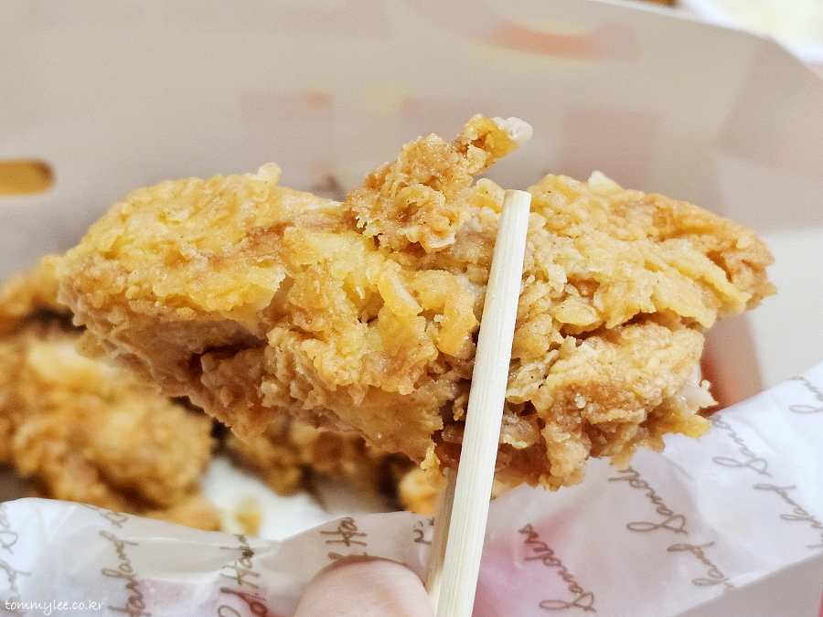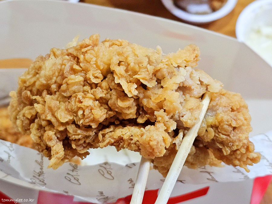 통다리 치킨을 집어 올리면 이런 느낌.. 엄청 무겁습니다.. 이 묵직함이 통다리 먹는 가장 큰 즐거움이 아닐까 싶기도..