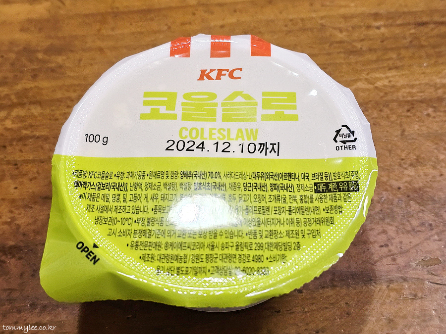 KFC 치킨의 동반자 코울슬로.. 깔끔한 맛이 특징인 KFC 코울슬로입니다.. 지인분께서 생각보다 유통기한이 짧다며 놀라심.. 살짝 방심하면 폐기가 잔뜩 나오겠다나 뭐라나.. 그걸 왜 걱정하시는 건지는 모르겠음.. 알아서 잘하시겠죠.. ㅋㅋㅋ..