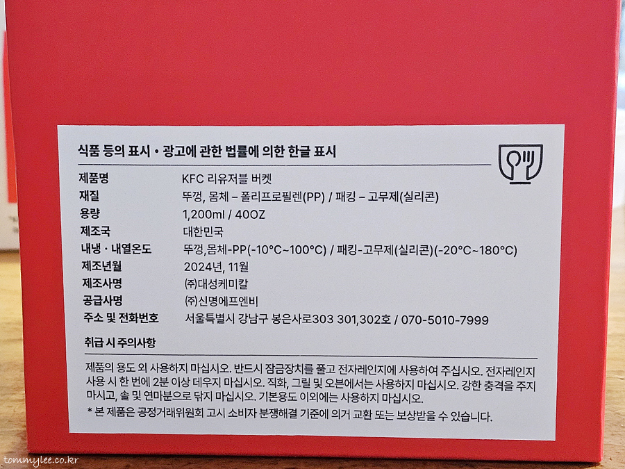 제품명 : KFC 리유저블 버켓.. 재질 : 뚜껑, 몸체 - 폴리프로필렌 / 패킹 -실리콘.. 용량 : 40온스, 1200ml.. MADE IN KOREA..