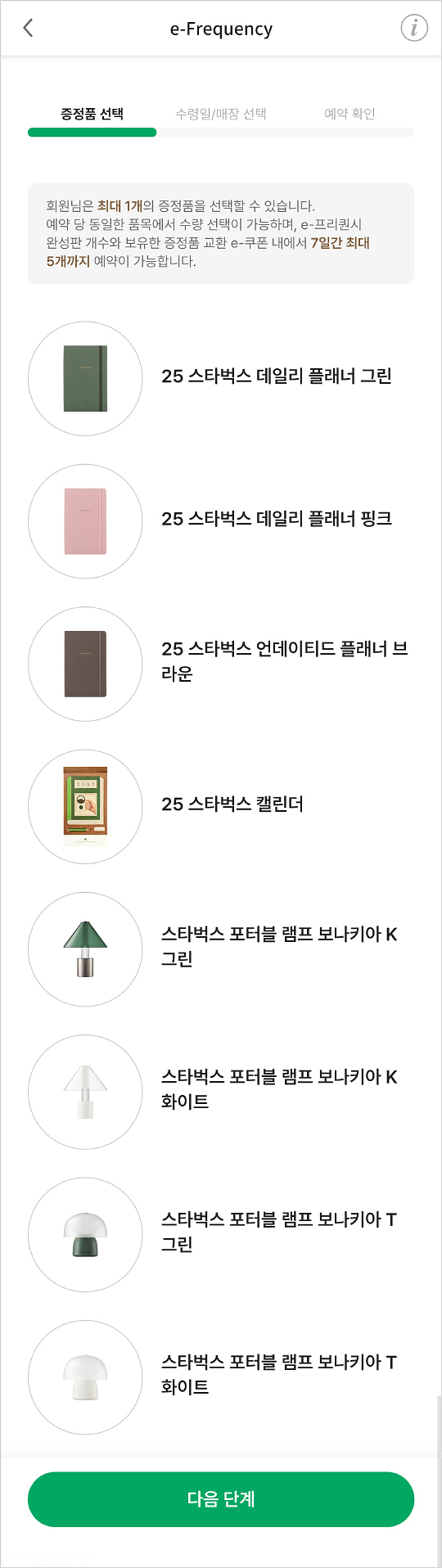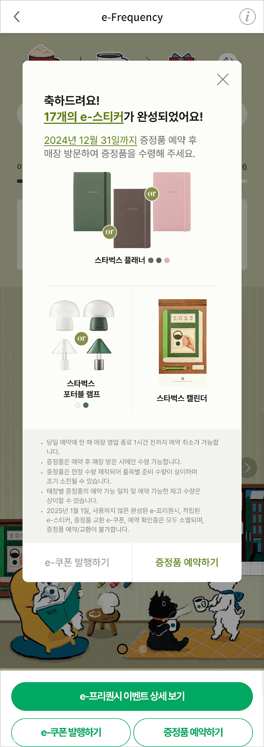 미션 음료 3잔 포함 총 17잔의 음료를 마시면 프리퀀시가 완성되는데요.. 스타벅스 앱에서 증정품 예약 후 매장을 방문해야 합니다.. 스타벅스 플래너 3종 또는 스타벅스 포터블 램프 4종 또는 스타벅스 캘린더를 받을 수 있다는 내용..