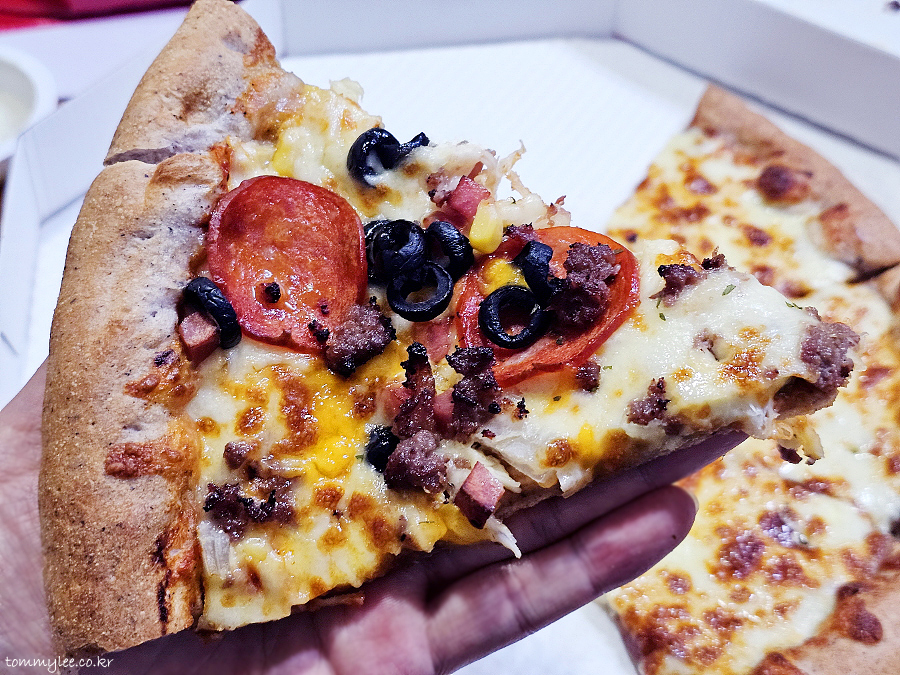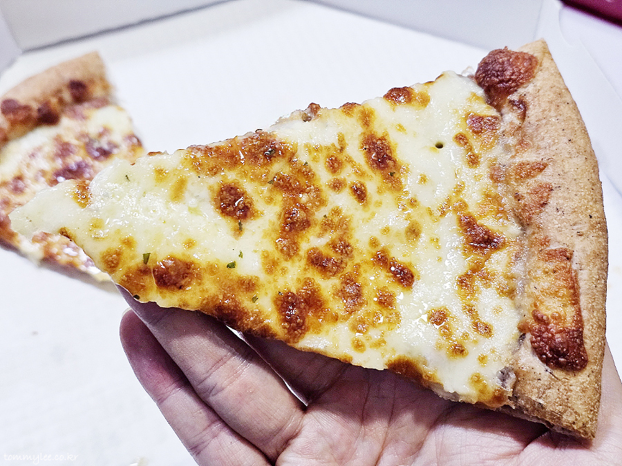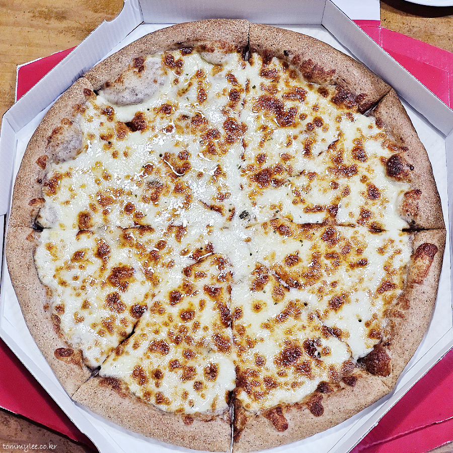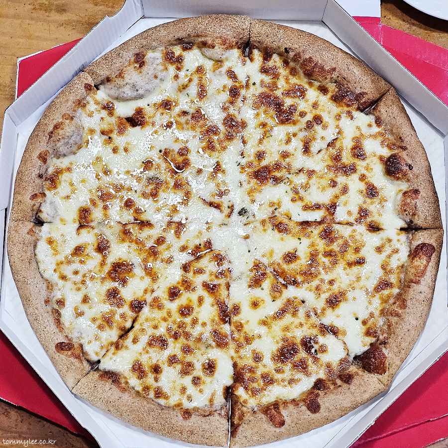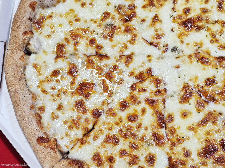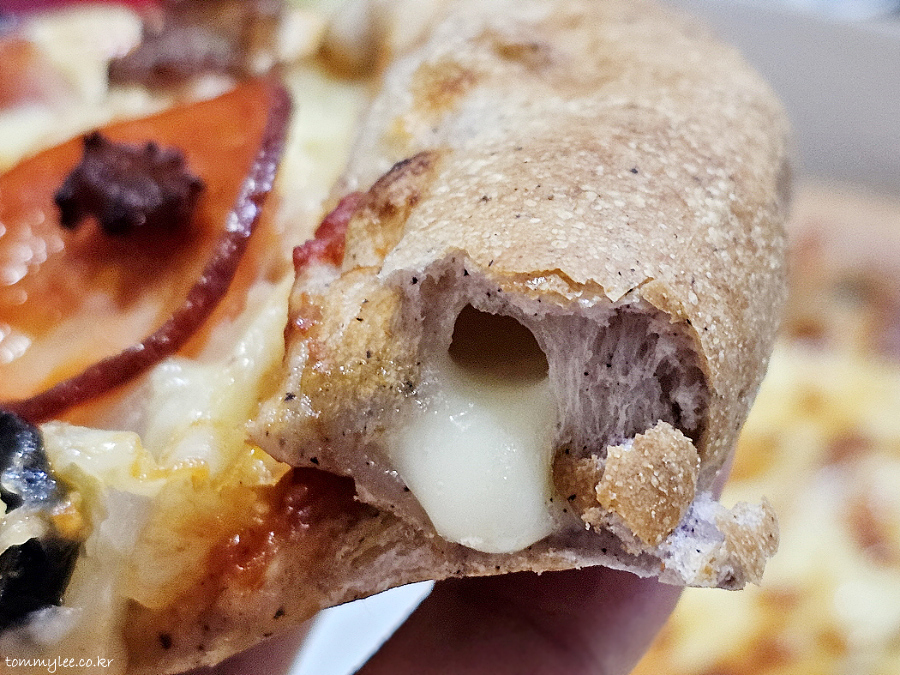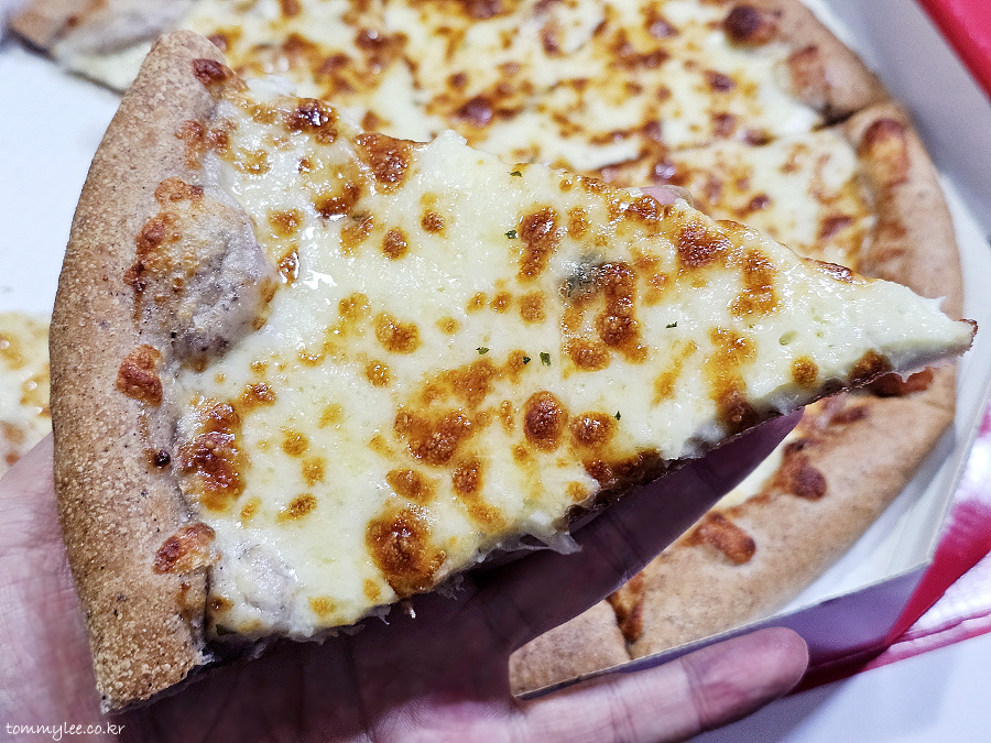리뷰 이벤트로 치즈크러스트를 추가해 봤습니다.. 원래는 치즈크러스트 도우로 변경 시 3,500원 추가.. 암튼 치즈크러스트라서 엣지 부분이 볼록하게 올라와 있는 모습이 되겠고요..